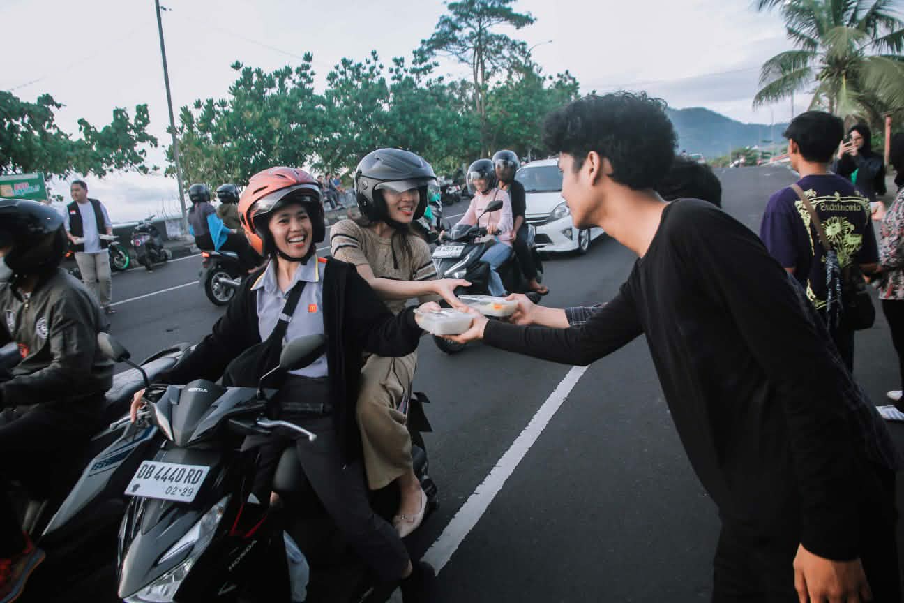 “Ia kami semua masih anak kuliahan dan juga ojek online jadi kami saling patungan dan kerja sama dengan Dompet Dhuafa untuk menyediakan kue dan makanan untuk di bagikan,” ujarnya.